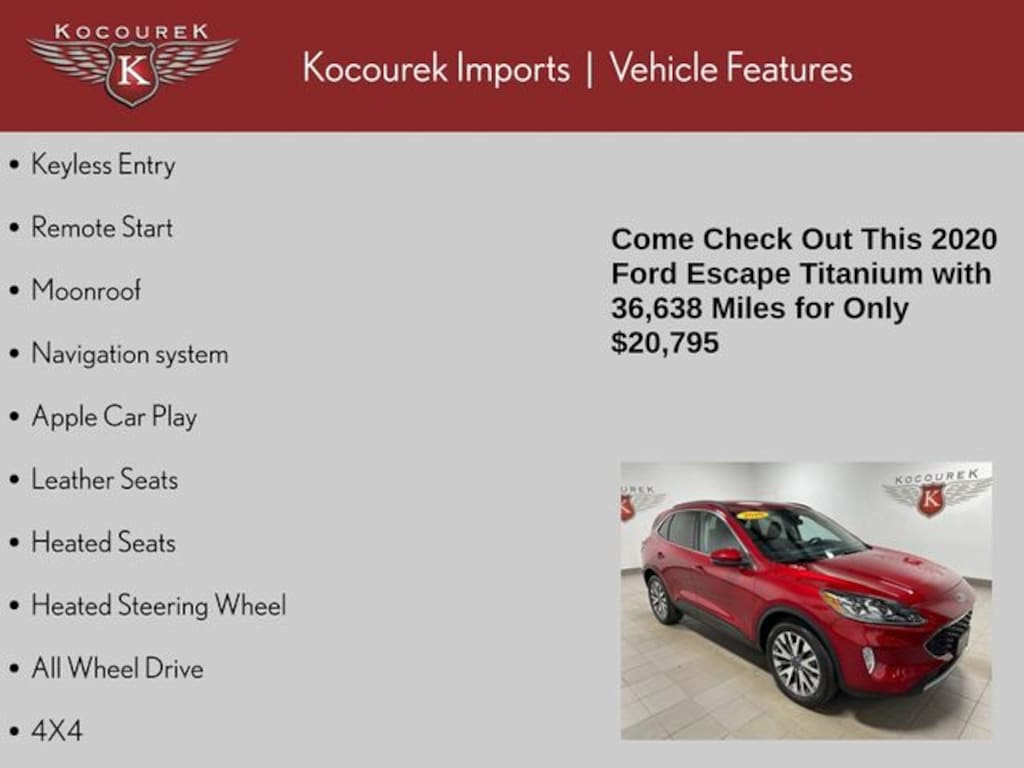 * JD Power Automotive Performance, Execution and Layout (APEAL) Study Please call one of our knowledgeable Sales Consultants with any question you might have. Serving guests in Marathon, Portage, Langlade, Oneida, Taylor, Vilias, Wood, Clark, Lincoln, Waupaca or near me! 2020 Ford Escape Titanium