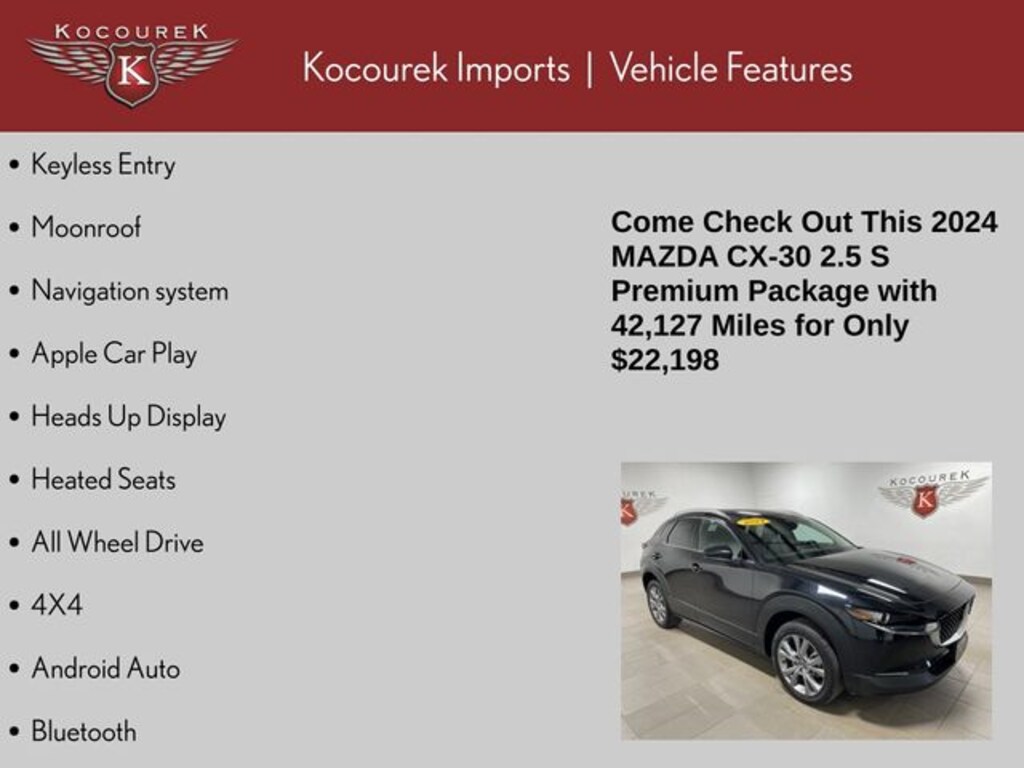 Please call one of our knowledgeable Sales Consultants with any question you might have. Serving guests in Marathon, Portage, Langlade, Oneida, Taylor, Vilias, Wood, Clark, Lincoln, Waupaca or near me! 2024 Mazda CX-30 2.5 S Premium Package